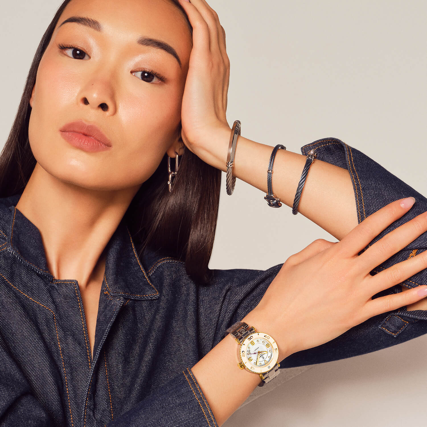 يتوفر تصميم Better Half بستة ألوان معدنية مختلطة، ويوفر تصميم Better Half stack عصري ومتعدد الأوجه ومبدع على الفور. تمثل كل قطعة رمزًا للشراكة والالتزام مما يضفي إحساسًا بالديمومة والأناقة على موسم الحب. عبّر لنصفك الآخر في أي وقت عن مدى حبك له مع مجموعة من خواتم Better Half bangles والخواتم.